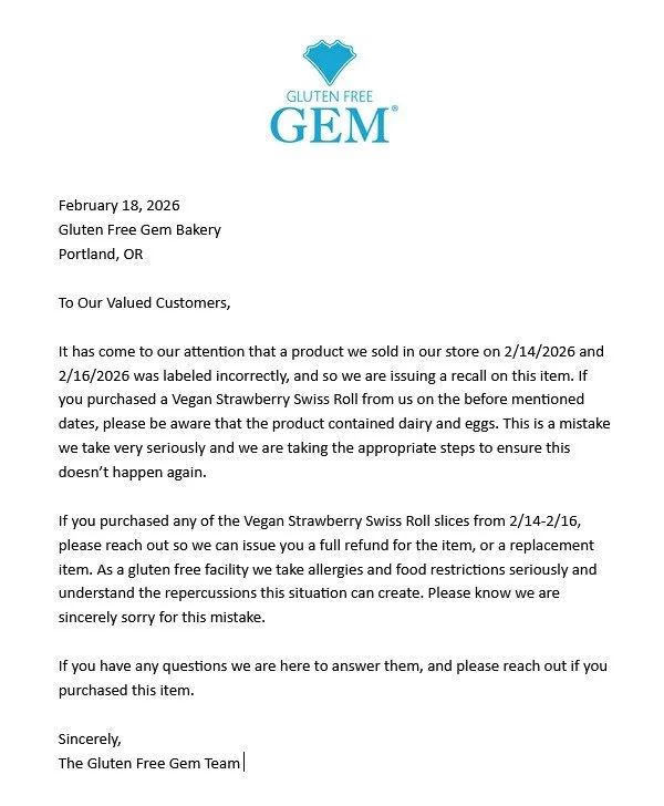 The bakery is a dedicated gluten free facility, to eliminate any risk of gluten cross-contamination. As part of our commitment to being 100% gluten free, we do extensive ingredient research to ensure that everything we use, as well as our facility, is clean of gluten. In addition to our gluten awareness, we train all our employees about the risk of cross-contamination from other allergens. We are continually educating ourselves on new research and information regarding Celiac Disease, gluten-intolerance, and gluten-free baking. We take the potential health risks of gluten contamination as seriously as the need for our pastries to taste delicious.