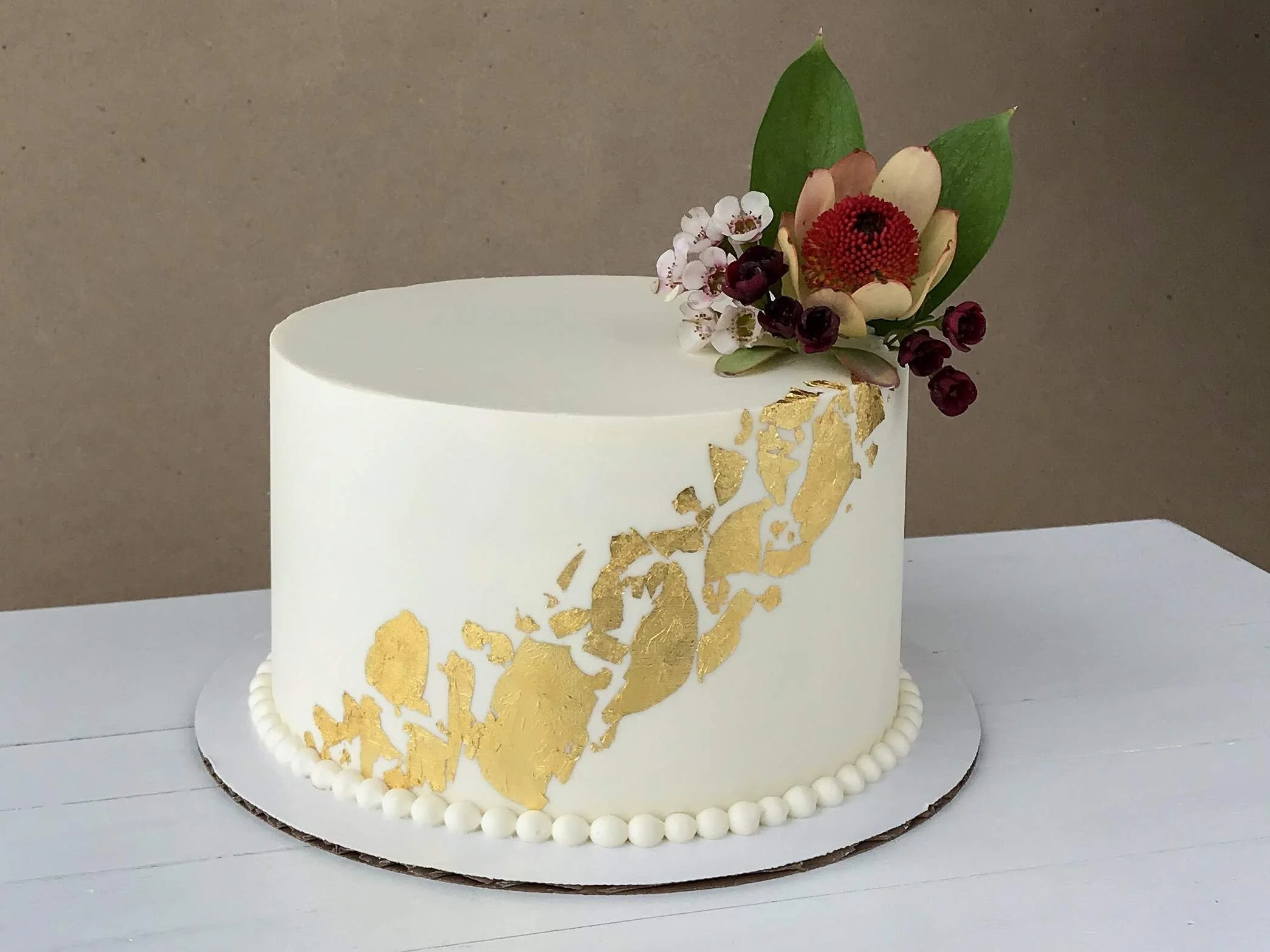 One tier cake with a pearl border, gold leaf and flowers (added by florist).